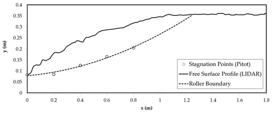 The hydraulic jump roller length was also estimated using the information collected in the experimental campaign. To this end, the stagnation point criterion was employed [33], taking the streamwise velocity vertical profiles measured in several sections throughout the hydraulic jump roller region. In each of these profiles, the point where velocity tended to zero, namely the stagnation point, was identified. The intersection between the line that joined all of the identified stagnation points and the averaged free surface profile led to the roller end section. With regard to the beginning of the hydraulic jump roller, it was directly located at the hydraulic jump toe (Figure 7). It is important to highlight the existence of intense fluctuations bound to the hydraulic jump nature that add uncertainty to the estimation of the roller length. Thus, there are fluctuations not only in the velocity field, but also in the free surface and the jump toe position. However, this criterion has proven to provide successful estimations of the parameter [4,33].