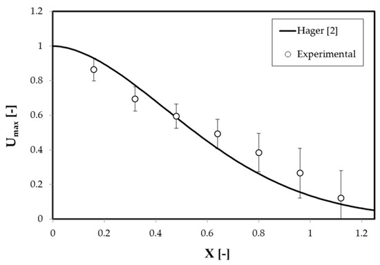 The first step in the analysis of the velocity distribution in the stilling basin model was focused on the maximum forward velocity decay. To this end, the expression proposed by Hager [2] for CHJ was compared with the experimental information collected in the model using the Pitot tube (Figure 8). The dimensionless value of the maximum velocity for each profile ( was obtained with the following expression: