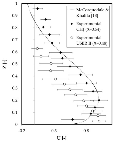 The uncertainty of the measurements performed to achieve the streamwise velocity vertical profiles was also considered through the error bars included in Figure 9. The hydraulic jump is characterized by intense velocity fluctuations [4,5], which are clearly reflected in the uncertainties obtained. It is important to highlight that no significant differences were found between the error bars obtained for the CHJ and the hydraulic jump in the typified USBR II stilling basin.