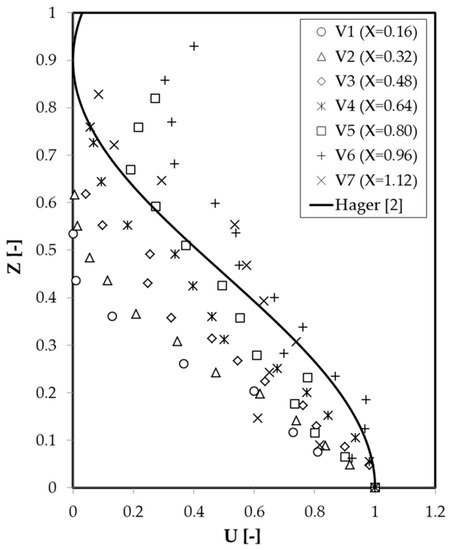 Despite the mentioned difficulties, further comparison of the measured profiles was conducted to gain a better insight into the influence of the energy dissipation devices on the velocity distribution. The profiles were represented together with the expression proposed by Hager [2] for the diffusion portion of velocity profiles in the CHJ roller region (Figure 10):