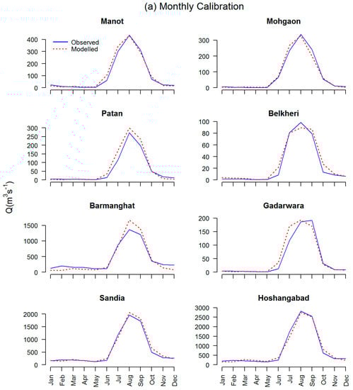 A general overview of the modelling approach used in this study is displayed in Figure 3. IMD (India Meteorological Department)/NCC (National Climate Centre) gridded rainfall and temperature data were used to drive the model for calibration and validation [53,66]. Potential Evapotranspiration (PET) was calculated from IMD temperature data using the FAO56 Hargreaves methodology [63]. Only years following the construction of all three dams (Table 2) were chosen for calibration and validation, to gain a better understanding of their impact on the hydrology in the Upper Narmada, and to represent their influence on the key hydrological processes within the basin. Following automatic calibration, model parameters were explored through visual inspection of modelled and observed hydrographs. Model output was aggregated to a monthly time step and assessed using statistical measures, including the Nash–Sutcliffe coefficient (NSE), the Pearson correlation coefficient (r) and the percentage deviation in simulated mean flow from the observed mean flow (Dv) [67]. Model performance statistics for the calibration and validation periods are shown in Table 4.