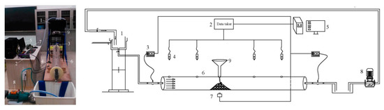 A transparent acrylic pipe with a pouring and monitoring system was used as the model in the orthogonal experiments. Figure 1 shows the photo and schematic diagram of the experimental set-up, which is composed of a tunnel prototype (labeled as 6), aggregate pouring system (9), data collection system (2, 4, 5, and 7), and water source (1, 3, and 8).