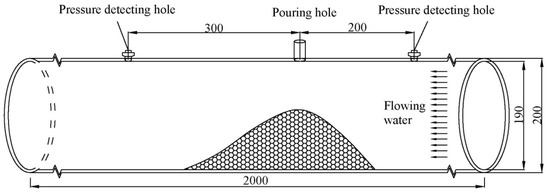 The transparent acrylic tunnel replica has a length of 2000 mm, an inner diameter of 190 mm, and wall thickness of 5 mm. A borehole used for pouring with a diameter of 25 mm was drilled on the tunnel roof 800 mm in the horizontal direction from the entrance of the water flow. Four boreholes with a diameter of 8 mm, which were used to detect water pressure, were drilled at a horizontal distance of 400, 600, 1100, and 1400 mm from the entrance of the water flow. Four water pressure sensors were connected to the boreholes with polyurethane tubing. The tunnel replica was fixed onto a support made of wood material. Figure 2 is the schematic diagram of the tunnel prototype.