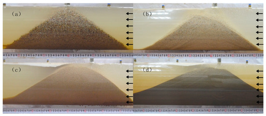 The aggregates were poured into the tunnel replica and gradually accumulated underneath the pouring borehole and moved along the tunnel. Pouring aggregate is a process in which the particles of the slurry settle and form a cone shape after the water–sand mixture is poured into the water in the tunnel. During the process of slurry settling, the aggregate particles are subjected to gravity, buoyancy, impulse force exerted by water, viscous drag forces, and other forces, which cause the aggregate deposits to move against the downstream direction of the water flow relative to the pouring hole of the aggregate. The offset distance of the deposited aggregate relative to the pouring hole is different depending on the aggregate particle size and the initial velocity of the water flow. Figure 3 shows the final shape of the deposition relative to the four different aggregate particle sizes in the tunnel. When viewed from the side, the deposition has a cone shape. Figure 3 shows that a smaller particle size results in a greater offset distance at the surface relative to the pouring hole. Therefore, the deposition shape is flatter. The shape of the deposited aggregate against the downstream side of the water flow is flatter than that against the upstream face of the water flow.
