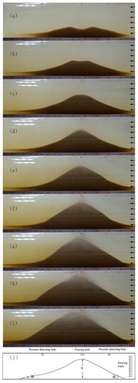 Natural granular soils have an underwater angle of repose, which is similar to the angle of internal friction of the material [34]. The angle of the cone shaped deposit is also shown in Figure 4. The underwater angle of repose of the deposited aggregate against the downstream side is slightly less than that against the upstream under the force of the water flow. The shape of the deposited aggregate can be defined by the angle of repose in accordance with the maximum height of the deposited aggregate. The angle formed between the dashed line and the bottom of the experimental set up can be considered as the approximate underwater angle of repose. Figure 4j shows the underwater angle of repose against the downstream side and the underwater angle of repose against the upstream side.