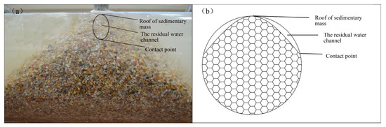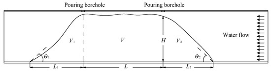 When the left and right sides of Equation (3) are equal, the particles are in the critical state where they will be transported without settling. Assuming that u is equal to at this time, can be called the critical velocity, which is the minimum velocity of the particles in which they change from static to motion. Therefore, the critical velocity can be used as the criterion for the formation of the section of the tunnel that resists water flow. When the deposited aggregate reaches the maximum height, the section of the tunnel that resists water flow is plugged as long as the maximum flow velocity under the pouring hole is less than the critical velocity. The residual water channel is the dominant pathway of flow, and the velocity of water in this channel is much greater than that of the flow in the void, so that seepage velocity in the void can be neglected.