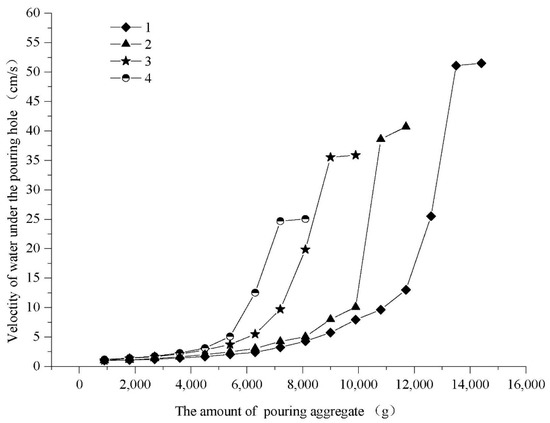 Figure 7 shows that there is little difference in the initial velocity of water flow. With increased aggregate, the water flow velocity obviously changes. The flow velocity of the coarse aggregate with a particle size of 2–5 mm quickly changes, but the maximum velocity of the water flow, which is the maximum flow speed when the minimum residual channel is reached, under the pouring hole is less than that for the fine aggregate. It is considered that the influence of the aggregate particle size on the water flow velocity is relatively substantial in this experiment. According to the experiment by Duckworth and Argyros [21], when solid particles are heavier than water, this means that the coarse aggregate results in a greater critical velocity. The critical velocity is influenced by the density of solid materials, slurry concentration, and particle composition. The influence of particle composition on the critical velocity is fairly significant. The critical velocity of the coarse aggregate is greater than that of the fine aggregate, but the final velocity of the water flow when the cross section of accumulated aggregate tends stable is relatively low.