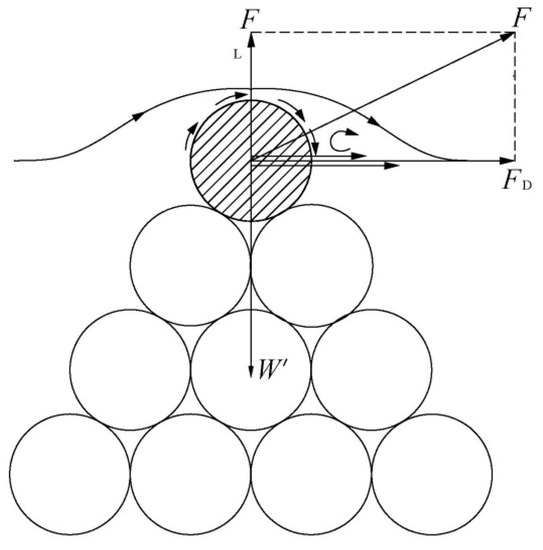 where is the unit weight of water, KN/m3; u is the velocity of water above particles, m/s; is the drag coefficient; is the lift force coefficient; is the friction coefficient between particles; is the unit weight of solid particles, KN/m3; and d is the diameter of particle, m.
