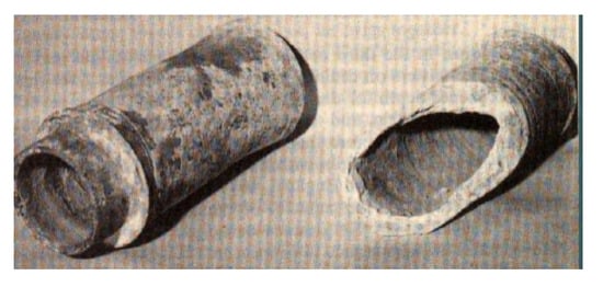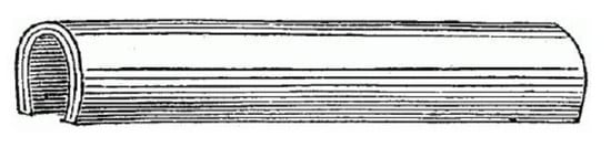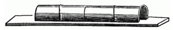 Klippart [3] stated horseshoe tiles (Figure 4) were the most widely used for a long time because of the ease in laying them. Chamberlain [29] pointed out, “the cylindrical tiles without collars or joints, have virtually superseded all other shapes of tiles, such as the horseshoe tiles, the sole tiles, the socket or collar tiles, the oval tiles, etc.,”. He considered the cylindrical tiles “as cheaper, stronger, better in all respects than any other; and for ordinary drainage there is no need of sockets, joints, or collars”. In addition, he recommended the purchase of “the fully cylindrical or the octagonal outside and cylindrical inside” that is made nearest and costs the least, if equally good otherwise. In 1903, Elliott [30] noted, “the best shaped tile is that in which the cross section is a circle, because can be laid more easily and give greater capacity for the material used”. Moreover, he recommended clay as suitable material for the construction of drains; that is, “tiles of circular cross section, of good clay, well burned, smooth and true in shape”. Eventually, the full cylindrical shape (cylindrical inside-outside) prevailed and was applied as a subterranean drainage conduit.