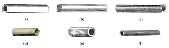 Clay pipes of variety of shapes: (a) Horseshoe tile and sole in one [3]; (b) Sole tile [25]; (c) Double sole tile [25]; (d) Tile with a flat base [28]; (e) Octagonal pipe tile [3] and (f) Cylindrical drainage tile [25]. (Processing has been made by Stavros I. Yannopoulos).