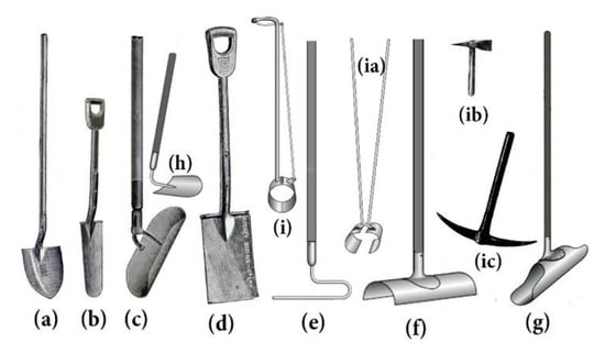 Digging and installation tools used in constructing tile drains by hand: (a) Ordinary Shovel [61]; (b) Bottoming Spade [29]; (c) Bottoming Scoop [29]; (d) Ordinary Spade [61]; (e) Laying Hook [62]; (f) Correction Hook [13] *; (g) Drain Scoop [13] *; (h) Hoe [13] *; (i) Pipe tongs [13] *; (ia) Soil pincer [13] *; (ib) Hatchet Pick [25]; (ic) Hand Pick [63]. (Conception, synthesis and processing have been made by Stavros Yannopoulos) (* by permission of Alterra-ILRI Publisher).