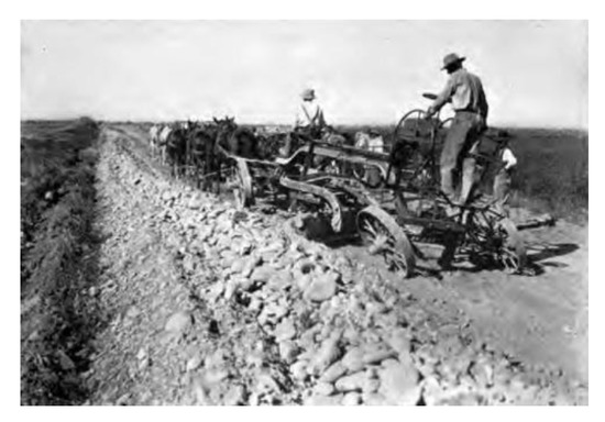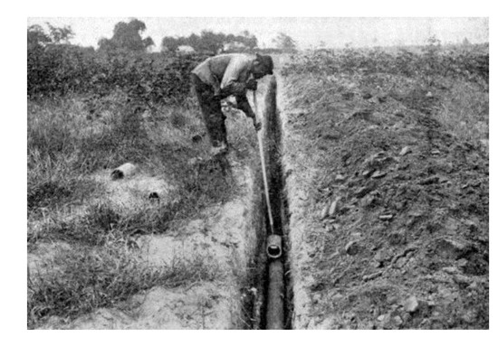 After installation and inspection, drain tiles were blinded by workmen standing beside the ditch, shoving excavated dirt from the sides of the ditch with a spade [20]. Refilling the trench was accomplished either by hand with a spade or/and horse drawn (i.e., plow) or power operated (i.e., V Drag, Grader, etc.,) implements [16,63]. Other tools used for filling ditches were V-Crowders, which are shod, light road-drags, and light road-graders [20].