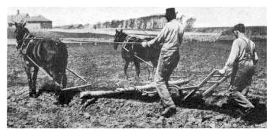 Yarnell [65] pointed out, “the more extensive use of tile-trenching machinery has been brought about by the rising prices and increasing scarcity of labor and the rapid extension of tile drainage for farm lands to increase crop production”. Jones [68], concerning the movement of the machines, considered that tile-trenching machinery may be divided into two general classes, namely: (a) horse-drawn ditching plows; (b) power-operated trenching machines. In reality, horse- or ox-drawn plows were already in use for digging ditches. These methods were economical only for ditches up to 1.5 m (5 ft) deep with bottom widths seldom exceeding about 1.2 m (4 ft). However, usually these ditches did not provide the drainage desired [14].