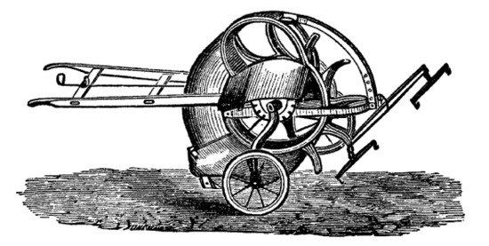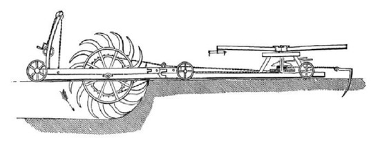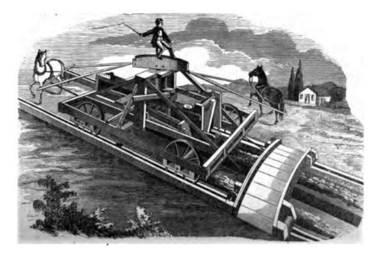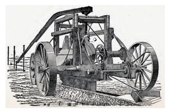 Around 1855, the Pratt and Brothers Co. at Canandaigua, New York, manufactured a sort of horse-drawn scraper, called Pratt’s Ditch Digger (Figure 13), with which a trench could be dug by means of a wheel. This first ditch-digging machine was called “Buckeye” [69]. Pratt’s machine (Figure 13) is worked by one or two horses, or by steam or water power, as was available locally [70]. The New York State Agricultural Society in the 1855 annual report considered Pratt’s Ditch Digger as “the most valuable machine” [70].