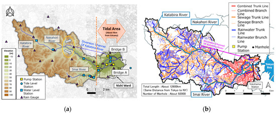 Overview of Katabira River basin: (a) elevation map; and (b) pipeline networks map.