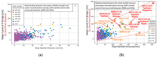Figure 3 shows the relationship between the peak rainfall intensity and water level deviation (Figure 3a) and between the total rainfall and water level deviation Figure 3b, at Bridge A (as shown in Figure 1a, 2.1 km upstream from the estuary) in the 1205 rainfall events that occurred for 11 years between 2008 and 2018. Here, water level deviation indicates the value obtained by subtracting the astronomical tide level at the estuary from the observed water level. Astronomical tide level is the predicted tide level and is calculated based on the tide levels observed in the past, and this tide level is not influenced by the weather. The maximum tide level deviation indicates the value where the tidal level deviation became the highest during a rainfall event. At the water level observation station of interest, it can be concluded that there is less correlation between peak rainfall intensity and water level deviation (Figure 3a), while there is correlation between the total rainfall and water level deviation (Figure 3b). Moreover, many of the events with maximum water level deviations are rainfall events caused by typhoons. The Katabira River basin is relatively large as an urban river, approximately 60 km2; thus, it is considered to be more susceptible to typhoon rainfall than short-term concentrated rainfall such as heavy guerrilla rainfall. Moreover, it is considered that the water level deviation becomes large due to the storm surge when a typhoon makes landfall because the Katabira River basin is located at the estuary and influenced by the tide level. However, there are variations in the maximum water level deviations of events with similar total rainfalls.
