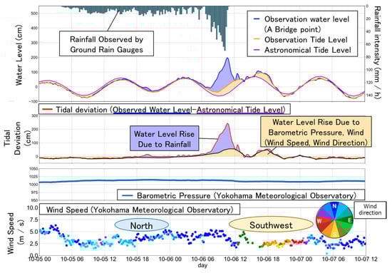 The relationship between water level deviation and weather conditions (at the time of Typhoon Phanfone making landfall in 2014).