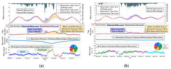 The relationship between water level deviation and weather conditions: (a) at the time of Typhoon Saola making landfall in 2017; and (b) during a heavy rain event in 2014.