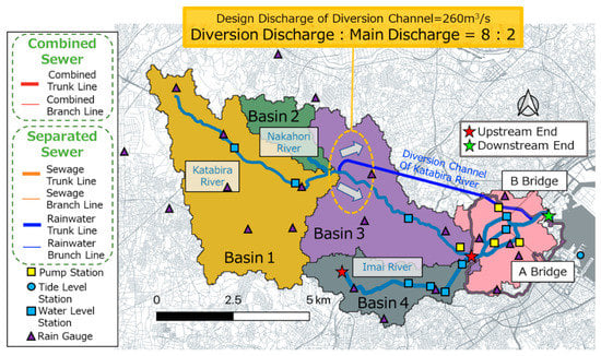 This paper is aimed at the Katabira River basin, which flows through Yokohama City, one of the largest cities in Japan. Yokohama Station is located at the estuary of the Katabira River, and flood damages frequently have occurred in the area around Yokohama Station, mostly due to typhoon damage [26]. The basin area of Katabira River is 57.9 km2, and the length of the main river channel is 17.3 km. Figure 1 shows an elevation map (Figure 1a) and a pipeline network map (Figure 1b) in the Katabira River basin. The estuary faces Tokyo Bay, and the tidal area is up to 4 km from the estuary. As shown in Figure 1b, there are different types of sewage systems within the Katabira River basin. In the upstream area, the system comprises separate sewers where the rainwater line and sewage line are separated, while, in the downstream area, the system is equipped with combined sewers where rainwater and sewage flow through the same single pipe. When viewing from the entire basin, the combined sewers are used in approximately 30% of the total area. In addition, facilities such as floodways for discharging overflowing rainwater during a flood and drainage pumping stations for controlling the flow of rivers are equipped in the basin. Figure 2a shows an aerial photo of the tidal area of Katabira River basin and Figure 2b shows a photo of Katabira River (upper stream from Bridge B in Figure 1a). The tidal area is a completely urbanized area and Katabira River is concrete-lined.
