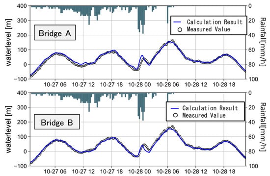 River and the Imai River is the area where combined sewers are used and rainwater is discharged through them, calculation of the runoff into the river was not conducted for this area and rainwater collection calculation and sewer pipeline calculations were conducted instead. The division of catchments is shown in Figure 8, with the area and runoff ratio of each catchment shown in Table 2. The flood concentration time was uniformly set to 1 h. The operational standard established by Kanagawa prefecture, which has been in use since 2004, was employed for the branching point of the Katabira River and its floodway, and the ratio of the runoff amount between the diversion channel and main stream was set at 8:2 until the flow through the floodway reached 260 m3/s. After that point, every runoff was set to flow into the main stream. When conducting the river channel calculation, the flow amount was given as the boundary condition to the upstream end of the Imai River and upstream from the confluence of the Imai and Katabira Rivers (the point indicated with a red star in Figure 8), and the tide level was given as the boundary condition to the downstream end of the Katabira River. The roughness coefficient n was set at n = 0.034 uniformly throughout the area [30]. A verification of the accuracy of the river channel runoff calculation was conducted by comparing the real measurement of the water level and the calculation result. The rainfall event used for the calculation was typhoon Saola from 2017 at the point of its arrival; the two days between 0:00 on October 27, 2017 and 24:00 on October 28, 2017 were studied. The rainfall data observed by the ground rain gauge were used for the examination. The accumulated rainfall during this event was 193 mm. Figure 9 shows the comparison of the calculation result and measurement. The measurement was reproduced at Bridge A, located 1.8 km from the river mouth, and at Bridge B, located 1.6 km from the river mouth (see Figure 8).