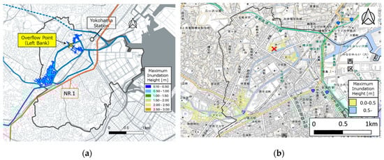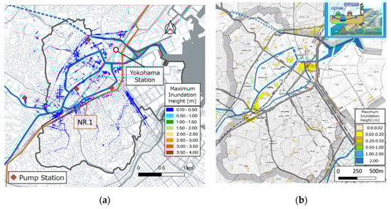 For the rainwater collection calculation, the collection area was defined by conducting a Voronoi tessellation on the subject area for each manhole of the pipeline, with equivalent roughness and slope inclinations given in order to solve using the kinematic wave method. The values of the equivalent roughness and slope inclination were set at ni = 0.01 and i = 0.360, respectively, in accordance with the aforementioned Table 1. The roughness coefficient within the pipeline for the sewer tracking calculation was set to 0.013, considering the length of approximately 192.5 km of pipeline and 10,009 manholes within the basin [24]. For the operation of the pump station, the operating conditions of three pump stations were considered. For the ground surface flooding calculation, the lattice size of the calculation result was set to 5 m mesh, and a numerical map of 5 m mesh was also used for the altitude [32]. Moreover, for the bottom roughness coefficient of the areas other than buildings, it was postulated that anywhere other than buildings were road, as was the case with the river water flooding analysis calculation, with 0.047 taken to hold uniformly throughout the basin area [27]. As there is no real measurement data that can be used for verifying the inland flooding calculation, as was the case with the river water flooding calculation, the calculation was conducted using the same conditions and rainfall data used to produce the inland water hazard map, with the examination conducted by comparing the calculation result and inundation area and the inundation depth shown in the inland water hazard map. The rainfall event used the same event as that described in Section 3.2.2. Figure 12 shows the comparison of the inland flooding calculation result and inland water hazard map. When examining the inundation situation of the area around Yokohama Station, indicated with a white dot, both the inundation area and inundation depth were mostly reproduced. However, the calculation result of the area around National Route 1 showed a deeper inundation depth than that of the inland hazard map. This was due to the fact that the inland hazard map does not represent the inundation situation of main roads. Thus, the validity of the calculation result could not be assessed.