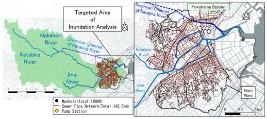 Flooding is one of the most frequently occurring natural disasters and impacts many people every year in the world [1]. Large-scale flooding can significantly impact local societies and their economies [1,2]. For example, economic damage from flooding in the United States has cost $260 billion (approximately ¥28 trillion) per year from 1980 to 2013 [3]. Similarly, between 1970 and 2008, floods caused at least 87 billion euros (approximately ¥10.4 trillion) in economic losses in Europe [4]. In Japan, the cost of damage from flooding between 1993 and 2002 was approximately ¥2.4 trillion. This amount can be broken down into approximately ¥1.1 trillion damage from inland flooding and roughly ¥1.3 trillion from river-water flooding [5]. If it is limited to the Tokyo Metropolitan area as the largest city, the damage cost of inland flooding accounts for approximately 80% of the total [5]. Based on these data, it is clear that inland flooding causes significant economic damage in Japan. Moreover, all large cities in Japan, in which the country’s population is concentrated (Tokyo, Yokohama, Osaka, Fukuoka, Nagoya, etc.), are all located in low-lying areas that surround ports [5]. Japan’s land can be broadly categorized into mountainous areas, hilly areas, plateau, low-lying areas, and inland water areas. When these area ratios are compared, mountainous and hilly areas represent roughly 70%; the population and properties are concentrated on plateau and low-lying areas that account for the remaining 30%. For this reason, Japan’s land is susceptible to receive inland flooding and high-tide damage. So-called urban flooding, which occurs in cities, has been occurring globally in recent years [6,7], and rapid urbanization is impacting the scale and frequency of such flooding [8,9,10,11,12]. Due to the progression of urbanization, rainwater that used to either seep into the ground or stagnated on the ground surface has started flowing directly downstream as surface water, thus increasing flooding damage in low-lying areas. Extreme changes in meteorological phenomena due to climate change are considered a global issue and are increasing the danger within cities [10,11,12,13,14]. In addition, climate change will raise sea levels and increase the risk of storm surges in coastal areas [15,16]. In addition, short torrential downpours known as guerrilla rainstorms are becoming frequent in Japanese cities. Specifically, the review of long-term changes in annual rainfall over time in Japan indicates a tendency toward increases in heavy rain, with more than 50 or 80 mm of hourly rainfall being observed [17]. Tropical cyclone activity is also increasing; it is said that high tides caused by the attacks of super typhoons will cause significant flood damages at Osaka Bay surrounding Osaka City, at Ise Bay surrounding Nagoya, and at Tokyo Bay surrounding Tokyo [2]. Based on the above factors, to respond to flood damage that may occur in the future in cities, it is necessary to shift to flood damage countermeasures that also consider the increase in external forces such as typhoons due to climate change. In the case of cities, rainwater is discharged into rivers via sewers. However, when heavy rainfall exceeds the external force envisaged by the design, river-water flooding occurs when the retention capacity of a river is exceeded, and inland flooding occurs when the discharge capacity of sewers is exceeded. A city is protected from flooding by these two systems working in balance. To accurately calculate/predict urban flooding, a model that can simultaneously calculate/analyze river-water flooding and inland flooding is needed. Furthermore, as discussed above, metropolitan cities in Japan are located in the places surrounding ports. Thus, there is a situation where the water level at the estuary rises due to storm surges and water flowing upstream, rendering the river unable to discharge its water into the sea. We must consider this kind of situation may occur [18,19]. Accordingly, what is necessary is a calculation method that takes the effect of a storm surge into account, in addition to river-water flooding and inland flooding.