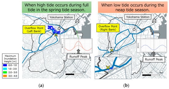 Comparison of the maximum and minimum inundation situations obtained through river water flooding analysis: (a) when high tide occurs during full tide in the spring tide season; and (b) when low tide occurs during the neap tide season.