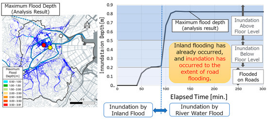 It was clarified in Section 4.2 that there is a time gap between the occurrence of river water flooding and inland flooding, and that inland flooding occurs first. Thus, the flooding process was analyzed by focusing on the chronological change of inundation depth at the point where it was deepest. Figure 15 shows the chronological change of inundation depth at the deepest point (indicated with the red dot). The inundation depth of the inland flooding started to increase approximately 40 min from the start of the calculation and reached its deepest inundation depth (about 0.2 m) after approximately 70 min. In contrast, the inundation depth of the river water flooding started to rapidly increase after about 90 min and its water level increased by some 0.6 m in approximately 20 min. As a result, the 0.8 m inundation depth at this point was anticipated to be from the flooding of the inland and river water. Upon examination of the protocol for issuing evacuation information in Japan [34], it was found that it is in principle issued in response to river water levels and does not consider inland flooding. As inland flooding commonly starts with the overflow of, for instance, manholes, the expansion speed of floodwater is not very fast, although that depends on the inclination of the terrain. Thus, it is considered to have little effect on evacuation. However, if inland and river water flooding occur simultaneously, a situation where people cannot evacuate due to inland floodwater and then get caught in floodwater from subsequent river flooding could be envisaged. Especially in large cities, there are many underground and commercial facilities, and there is a high probability that inland floodwater flows in and inundates underground facilities. Moreover, with respect to the doors of buildings, it is understood that doors that open outwards can no longer be opened when the depth of inundation reaches 26 cm, while doors that open inwards can no longer open when the depth of inundation reaches 47 cm [35]. Thus, there is also a possibility that one cannot evacuate a building when floodwater reaches certain depths. Furthermore, the flow speed and depth that would allow an adult male to walk safely through water is considered to be less than 1 m/s when the water depth is no more than 0.4 m [35]. Thus, if a person does not immediately evacuate when inland flooding occurs, it is possible that s/he will lose his/her life from subsequent river flooding. In light of the factors discussed above, it can be inferred that in a large city, river water flooding may take place after the occurrence of inland flooding. Therefore, it can be said that unless the occurrence of inland flooding is predicted and evacuation information is issued at that point in time, a situation where subsequent evacuation would be difficult can be anticipated.