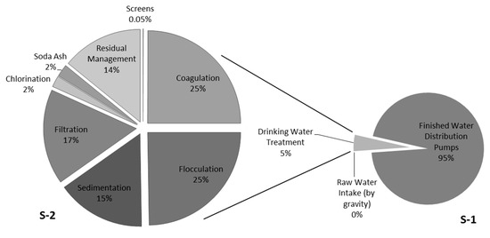 Energy consumption was evaluated for two main scenarios for the selected treatment plant. Scenario 1 (S-1) represents analysis for the DWTP including water distribution pumps, whereas Scenario 2 (S-2) represents the analysis for the DWTP without including the water distribution pumps.