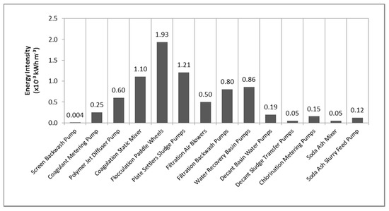 Treatment of water is an energy-intensive process. Various studies have evaluated the energy consumption for drinking water treatment [6,7,8,9,10,11,12] and wastewater treatment plants [13,14,15,16,17]. More studies exist for wastewater treatment facilities compared to DWTPs. Ref. [12] conducted a literature review and compared energy consumption of a conventional water treatment in various countries including Australia (0.01–0.2 kWh m−3), Spain (0.11–1.5 kWh m−3), New Zealand (0.15–0.44 kWh m−3), U.S. (0.184–0.47 kWh m−3), Canada (0.38–1.33 kWh m−3), and Taiwan (0.16–0.25 kWh m−3). Similar studies were also conducted by [9]. Ref. [8] determined the energy consumption of a DWTP, treating 0.017 m3 day−1 of river water, located in Jamshoro Pakistan, as 7.4 Wh m−3. The largest consumers of energy were the processes of chlorination (because of on-site generation of chlorine dioxide) and coagulation, consuming about 34% and 31% of the total operational energy consumption of the DWTP. Ref. [11] studied the effects of mixing intensity on floc formation as well as the associated energy consumption.