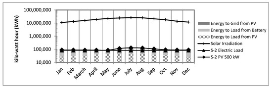 The energy consumption estimate determined using the steps outlined in Section 4.1 was used as an electric load input for sizing solar PV. Electricity generation by the PV system meets the facility’s electrical load that would otherwise be met by electricity from the grid and hence reduces the electric bill. Time of use (TOU) electricity rates for large general service were applied that mainly consist of energy charges, demand charges, fixed monthly charges, and facilities charges. Summer months comprised of July, August, and September, whereas the remaining months were treated as winter months. Electricity rates are different for summer and winter months. Rate charges are also based upon voltage levels categorized as secondary (≤600 V), primary (levels between 600–25,000 V), and high voltage transmission (>25,000 V). Rates for secondary voltage levels were applied for the DWTP.