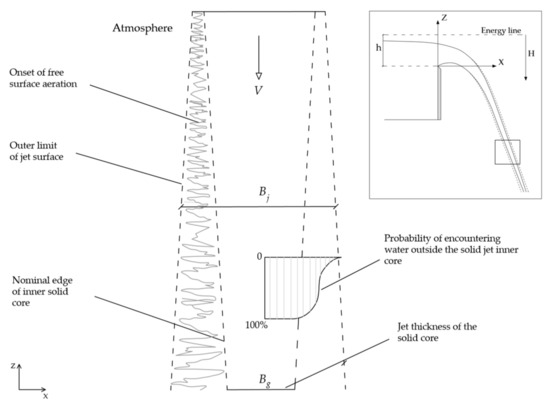 According to Ervine and Falvey [8], turbulence is paramount in the air entrainment mechanisms in jets; turbulence fluctuations affect the jet spread and deformations of the free surface. Self-aeration may be related to the turbulence boundary layer and the turbulent mixing processes. The internal turbulence in the jets forms small waves and instabilities on the surface at the beginning of the jet. The growth of these instabilities is related to the surface tension. Later, instabilities and waves are amplified in the flow direction. The velocity of the non-aerated jet core is the same as the air entrained within the turbulence instabilities in the free surface. Finally, turbulent fluctuations are large enough to penetrate and affect the non-aerated core of the jet. The surface tension and the turbulent layer influence the jet break-up length (Ervine et al. [9]). Through the air–water interphase there are continuous exchanges of mass and momentum between water and atmosphere (Chanson and Toombes [10]). According to Bertola [11], the air–water properties of rectangular free-falling jets may be determinant in the energy dissipation and the air entrainment in plunge pools. The energy dissipation mechanisms in rectangular free-falling jets can be divided into several steps (Castillo et al. [7]): spreading of the jet during the falling (aeration and atomization), entrainment of air and diffusion of the jet in the water cushion, impact on the basin bottom and recirculation and diffusion in the basin. Figure 1 shows a sketch of the spreading of a rectangular free-falling jet in the atmosphere.