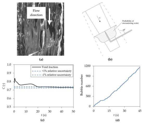 Previous analyses have shown that at least 30 s are needed for obtaining an uncertainty of about ±1% in the void fraction (Figure 2c). With these conditions, each measurement was sampled at a frequency of 20 kHz for 45 s. Figure 2d shows the cumulative number of bubbles detected during the sampling time.