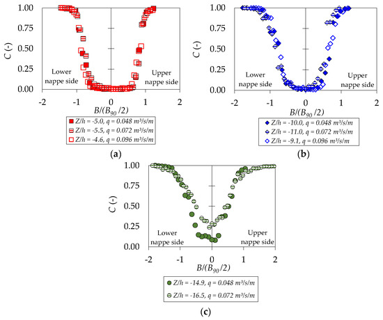 For falling distances Z/h between −14.9 and −16.5 (Figure 3c), air entrainment is noticeable in the entire cross-section, with minimum values of void fraction of 0.08 < C < 0.24. As the water falls, the slopes of the void fraction distribution of the upper and lower nappe sides tend to be less sharp.