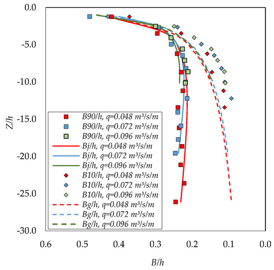 As stated by Carrillo et al. [18], although the jet thickness values may be affected by fluctuations in the nappe jet, the B10 values seem to be similar to the jet thickness due to gravitational effects, while the B90 values seem to be quite similar to the Bj values obtained with Equation (1).