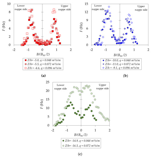 Figure 5 shows the air–water phase count rate F. At the beginning of the fall, the maximum values of the interference frequency are observed in the limits of the free surface of the jet, corresponding to the upper and lower nappe trajectories, with maximum values in the lower nappe side being slightly higher than in the upper nappe side. These maximum values tend to increase with the dimensionless falling distance Z/h: for values Z/h between −4.6 and −5.5 (Figure 5a), the maximum values are between 6 and 8 Hz; for Z/h between −9.1 and −11.0 (Figure 5b), the maximum values of F are between 8 and 14 Hz; and for dimensionless falling distances Z/h between −14.9 and −16.5 (Figure 5c), the bubble count rate tends to increase to 13–21 Hz.