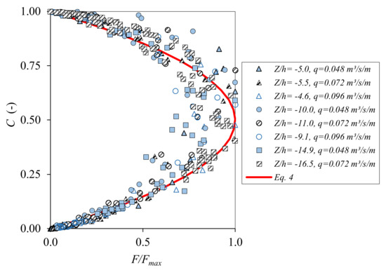 Following these ideas, Figure 6 shows this normalization for the nappe flow case. The maximum values of F/Fmax may be observed at around C ≈ 0.50 (50% of the void fraction). For the range of velocities tested (from 2.5 to 6.5 m/s), the normalization seems to be independent of the jet velocity, jet thickness and aeration and the dimensionless falling distance. Considering the dispersion, the experimental data reasonably fit with Equation (4) in relation to rectangular free-falling jets.