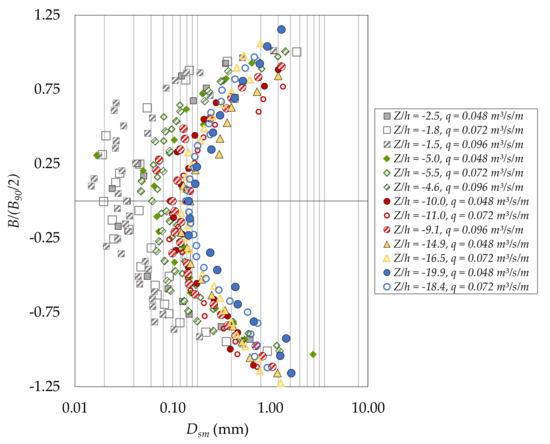Figure 7 shows the Sauter mean air bubble diameter for different falling distances from the weir. The plot has been limited to the C ≤ 0.9 values. In general, the Sauter mean diameter values are between 0.02 and 1.0 mm, with maximum values below 3.0 mm. Minimum values are obtained in the center of the jet in all the cross-sections, with maximum values being obtained as the measurement locations move to the free surface of the nappe. The minimum values also increase as the falling distance increases in the closer sections. After falling distances of around 5–6 times the energy head (Z/h > 5–6), the minimum Sauter mean diameter tends toward a constant value around 0.1 mm. Data show a relatively low deviation from the symmetrical behavior tending to the lower nappe side, with skewness values of between 1 and 2 for q = 0.048 m3/s/m, 1 and 3 for q = 0.072 m3/s/m and 2 and 3 for q = 0.096 m3/s/m, where values closer to zero indicate a symmetric trend and lower dispersion.