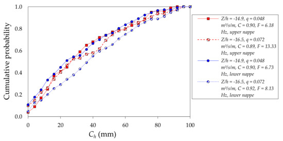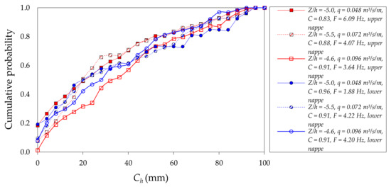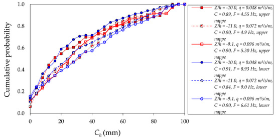 Some authors (e.g., Toombes [22], Chanson and Carosi [33], Felder, [34]) have considered the bubble chord length distributions as a probability distribution function (PDF) in the form of a frequency histogram. Other authors (e.g., Herringe and Davis [35]) have presented these data as a cumulative probability distribution function. Figure 8, Figure 9, Figure 10 show the cumulative probability distribution functions obtained for the bubble chord lengths that were measured in the upper and lower nappes of the rectangular free-falling jets. The bubble chord lengths have a wide range of values (from zero to 100 mm). The maximum slopes of the cumulative distribution were obtained with the smaller bubble chord lengths (between 0 and 20 mm) in the three falling distances that were analyzed. The cumulative probability distribution function slopes tend to reduce as the bubble chord length increases. In general, the distributions of the upper and lower nappe sides show the same trend, and few differences are observed as a function of the normalization of the falling distance Z/h. These values agree with the results obtained by Brattberg [31] in two-dimensional water jets, whose representative probabilities were between 2.0 and 2.5 mm with the maximum chord lengths of up to 100 mm.