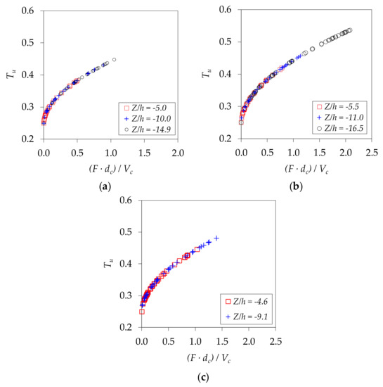 Dimensionless relationship between turbulence intensity Tu and B/(B90/2) in rectangular free-falling jets: (a) q = 0.048 m3/s/m, Z/h = −5.0; q = 0.072 m3/s/m, Z/h = −5.5; and q = 0.096 m3/s/m, Z/h = −4.6; (b) q = 0.048 m3/s/m, Z/h = −10.0; q = 0.072 m3/s/m, Z/h = −11.0; and q = 0.096 m3/s/m, Z/h = −9.1; (c) q = 0.048 m3/s/m, Z/h = −14.9; and q = 0.072 m3/s/m, Z/h = −16.5.