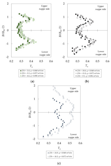 Figure 12 shows the turbulent intensity distribution as a function of the dimensionless distance from the center of the jet B/(B90/2). The Tu distribution is similar in the lower and intermediate falling distances (Figure 12a–c), with the maximum peaks obtained in the free surface of the jet in the upper and lower nappe sides. Among them, the maximum values tend to be slightly higher in the lower nappe side. Outside the B90 jet thickness, the turbulence intensity tends to reduce rapidly. As the air entrainment reaches the inner core of the jet, the differences between the center of the jet and the maximum peaks tend to reduce. In the furthest cross-sections from the weir crest (Z/h = −14.9 and −16.5), the differences in the turbulent intensity are more remarkable due to the differences observed in the phase change frequency F (see Figure 5c).