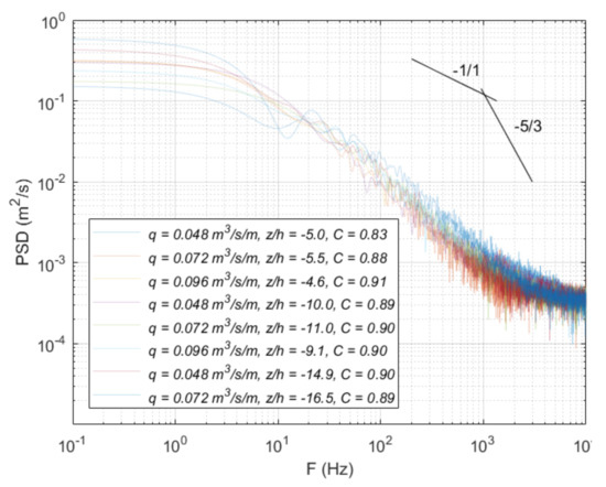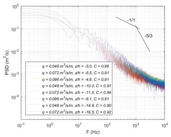 Figure 13 and Figure 14 show the power spectral density in different falling distances, corresponding to the upper and lower nappe sides, respectively. Independently of the normalized falling distance to the weir crest Z/h, similar behavior is found in the upper and lower nappe sides. For frequencies between 0.1 and 1 Hz, the power spectra density shows the higher values in each case. For frequencies between 101 and 103 Hz, the spectral curves show a rapid decay, with a quasi linear slope. This may be considered the viscous dissipation range. For frequencies higher than 103, the power spectral density tends to stabilize at the same PSD value. These values are similar to those obtained by Wang [36], who analyzed the power spectral density with a phase detection conductivity probe in hydraulic jumps.