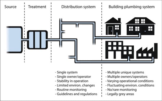 From an ecological perspective, understanding the link between changes in environmental conditions and changes in the drinking water microbiome is interesting. Unfortunately, changes such as these may also have profoundly adverse consequences for the drinking water quality. For example, the increased detection of Mycobacterium avium in a DWDS was linked to water age and the depletion of chlorine during distribution [30], and seasonal temperature changes within several DWDS were correlated with the growth of coliforms [31]. The most dramatic, least understood, and usually uncontrolled changes in environmental conditions occur when water from the DWDS enters building plumbing systems (also referred to as “premise(s) plumbing” [32,33] or “domestic plumbing” [34,35]). As discussed below, the environmental conditions between and within building plumbing systems change dramatically relative to the DWDS and relative to each other (Figure 1), and consequently so does the microbiology.