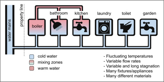 Apart from legal aspects, additional challenges stem from the complexity of building plumbing systems. Not only are there thousands of unique buildings connected to each DWDS (e.g., >20,000 single-family houses in the City of Zurich (data 2010 [39])), but each building plumbing system also consists of multiple, different sub-units such as boilers, rising mains, and ring mains. In addition, each system typically has warm and cold water outlets (Figure 2), with hoses, taps, and various connected home appliances (e.g., a washing machine), all of which will potentially create unique and very different environments. From a microbiological point of view, bacteria that enter a building plumbing system from the DWDS experience an immediate and considerable change in environmental conditions, and it is common knowledge that a change in environmental conditions will often result in a change in bacterial numbers [40], viability [41], activity [42], and composition [43].