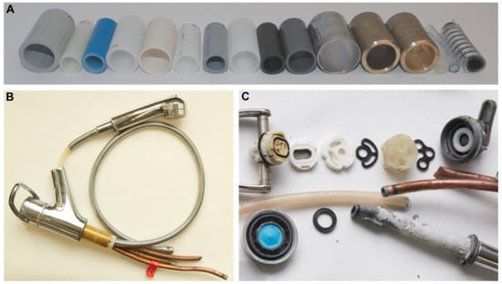 Variety of materials used within building plumbing systems and fixtures. (A) Different pipes and hoses from metals and both hard and flexible synthetic polymeric materials. (B,C) Materials used in a single kitchen tap.