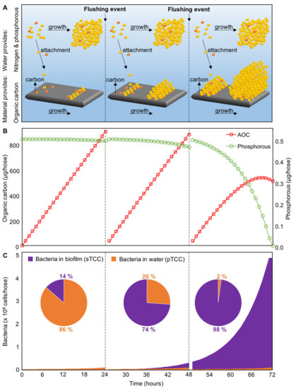 Theoretical example of initial biofilm formation on a new flexible synthetic polymeric material (e.g., PVC-P shower hose). (A) Visualization of the initial stages of biofilm formation, driven by attachment (water-to-surface dispersal) and (nutrient-based selective) growth. (B) Nutrient concentrations with phosphorous deriving from the water and assimilable organic carbon (AOC) migrating from the material. (C) Quantification of bacterial growth, showing rapid domination of the biofilm in the overall distribution of bacteria.