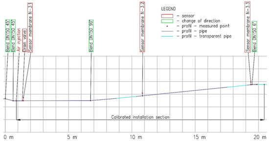 Profile of the analyzed installation section with a siphon 19.83 m in length; the liquid flow is from left to right.