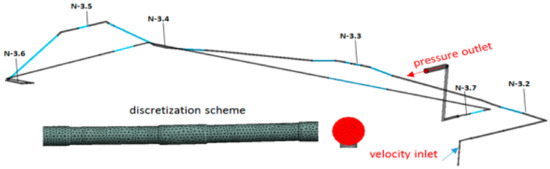 By creating a 2D model for the pipeline with a siphon, the relevant spatial fragment of the installation is presented on the plane while respecting the length of individual pipeline sections (Figure 5). On the basis of the flat profile of the pipeline obtained in this way, a two-dimensional model was developed, whose calculation grid consists of 27,236 knots and 25,587 elements. An average grid quality index of 0.98 was obtained.