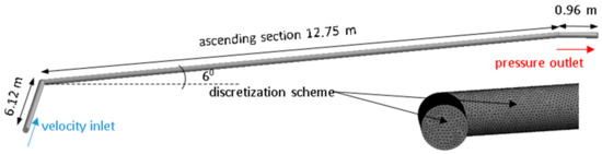 The modelled section of the installation has a diameter of DN150, with the slope of the ascending pipe being 6° (Figure 4). For the model being created, a spatial calculation grid has been defined, consisting of 2,327,135 knots and 1,583,009 elements. An average grid quality index of 0.96 was obtained.