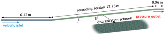 Similar to the 3D model, the length of the modelled pipeline is 19.83 m, the pipe has a diameter of DN150, the slope of the ascending section is 60 and the pipeline roughness coefficient is k = 0.0001 m. The functions velocity inlet, pressure outlet and wall are assumed for the inlet, outlet and wall of the modelled pipeline respectively.